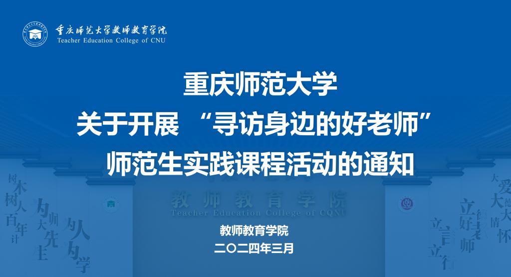 重庆师范大学关于开展 “寻访身边的好老师”师范生实践课程活动的通知为全面贯彻习近平总书记关于教育的重要论述和党的二十大精神,落实中共中央、...