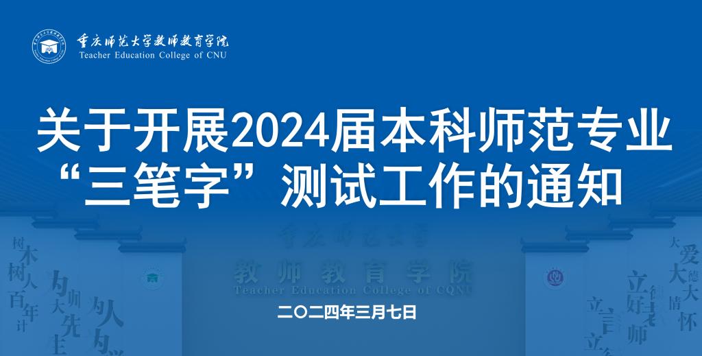 关于开展2024届本科师范专业“三笔字”测试工作的通知各相关学院:根据《重庆师范大学教育类研究生和师范生教育教学能力考核实施方案(修订)》(...