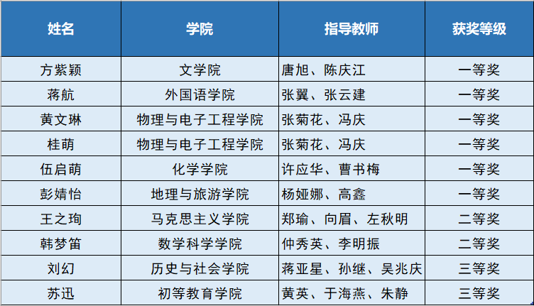 本次“田家炳杯”全国师范院校师范生教学技能竞赛共计226所学校1611名选手参加初赛,其中485名选手进入决赛。我校11名选手参加了全部组别的竞赛,9人进入决赛。文学院方紫颖、外国语学院蒋航、物理与电子工程学院黄文琳及桂萌、化学学院伍启萌、地理与旅游学院彭婧怡获一等奖;马克思主义学院王之珣、数学科学学院韩梦笛获二等奖;历史与社会学院刘幻、初等教育学院苏迅获三等奖。