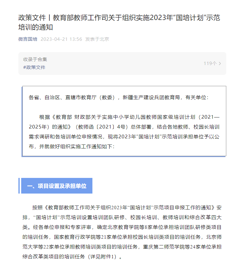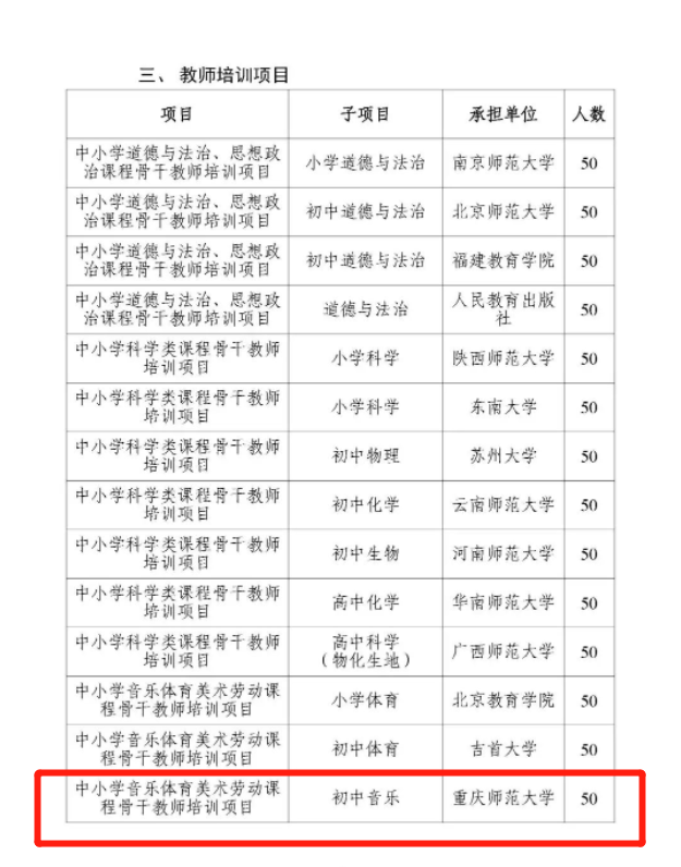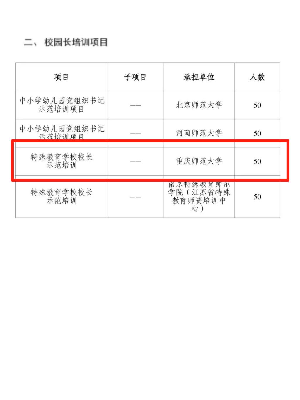 近日,教育部教师工作司下发《教育部教师工作司关于组织实施2023年“国培计划”示范培训的通知》(教师司函【2023】8号)文件,公布2023年教育部“国培计划”示范项目的评审结果。我校再创佳绩,成功获批两项教育部“国培计划”示范项目,分别是校园长培训项目——特殊教育学校校长示范培训和教师培训项目——中小学音乐体育美术劳动课程骨干教师培训项目(初中音乐),持续发挥了学校在国家层面教师教育培训中的影响力。