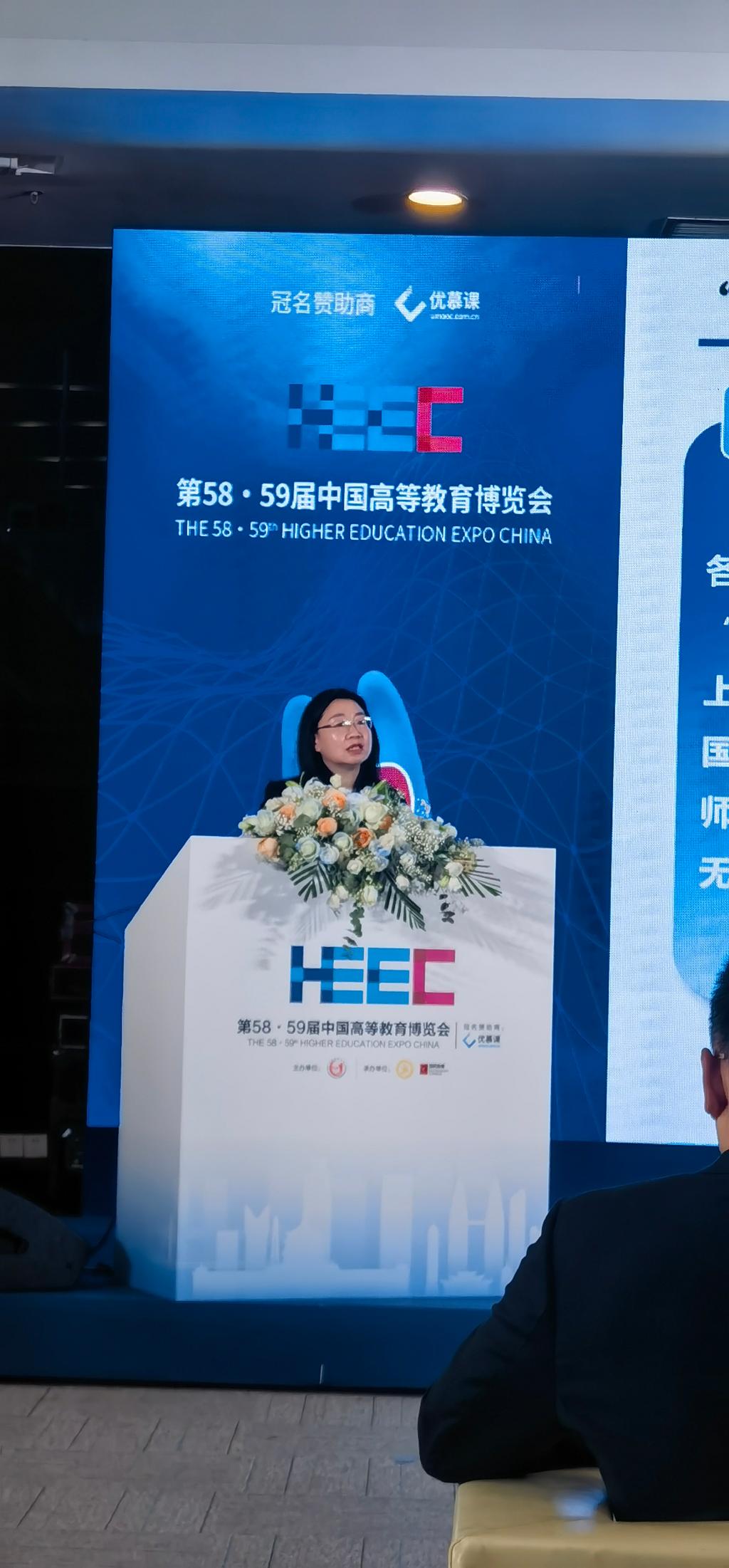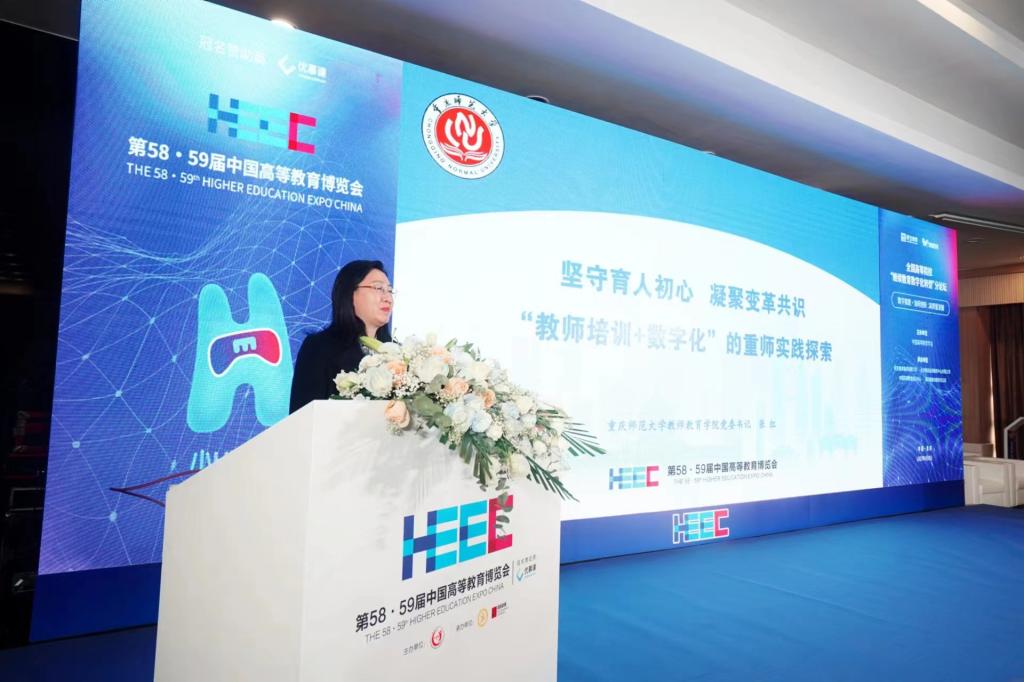 第58·59届中国高等教育博览会4月8日在重庆渝北国际博览中心隆重开幕,4月10日上午以“数字赋能教育,教育塑造未来”为主题的“继续教育数字化转型”论坛在M204会议厅举行。mansion88明升党委书记、副院长张红代表学校参加了本次分论坛并作了主题为“坚守育人初心 凝聚变革共识‘教师培训+数字化’的重师实践探索”的报告。