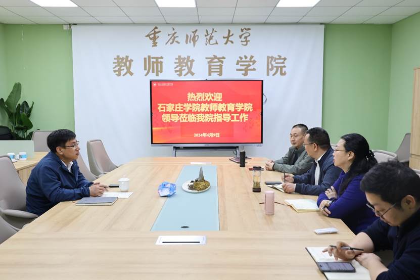 首先孙志勇院长对石家庄学院mansion88明升的情况进行了介绍。李祚山院长对孙志勇院长的到来表示热烈欢迎,并就重庆师范大学mansion88明升的职能职责、学科发展、实习实训中心建设、教师发展以及近年来取得的成绩进行了介绍。党委书记张红就教育培训工作和学院文化建设进行了深入交流与经验分享,对双方进一步加强交流与合作提出了期望。