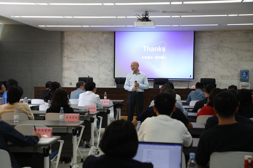 培训会上,北京大学教授、中国虚拟现实与可视化产业技术创新战略联盟教育委员会主任郝永胜以ChatGPT技术为切入点,剖析了数字化对高等教育带来的冲击与影响,阐明了教育数字化的必然趋势。郝永胜以数字教学示范学院的建设为重点,深入解读了课程知识图谱建设、数字教材建设、虚拟课程室建设、虚拟仿真课程教学项目建设、教师数字化能力培训以及数字教学典型案例六大核心板块,为教师掌握数字化教学提供了宝贵的经验和建议。最后,郝永胜结合我校实际情况,就“地方院校如何建设数字教学示范学院”给出了具体指导,为学校的数字化教育改革指明了方向。