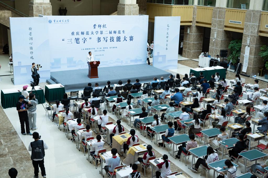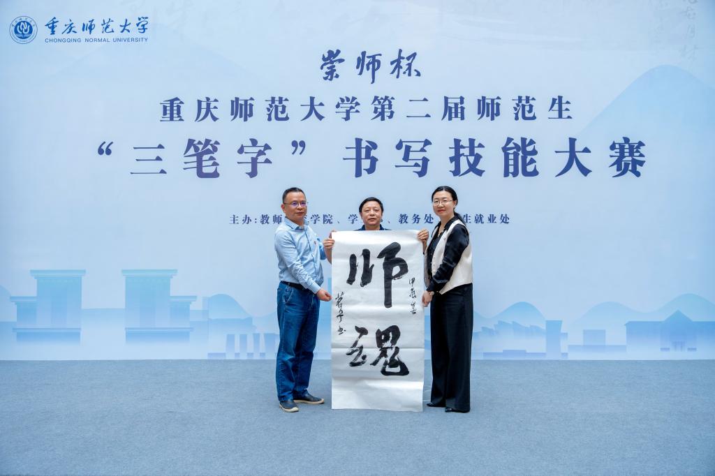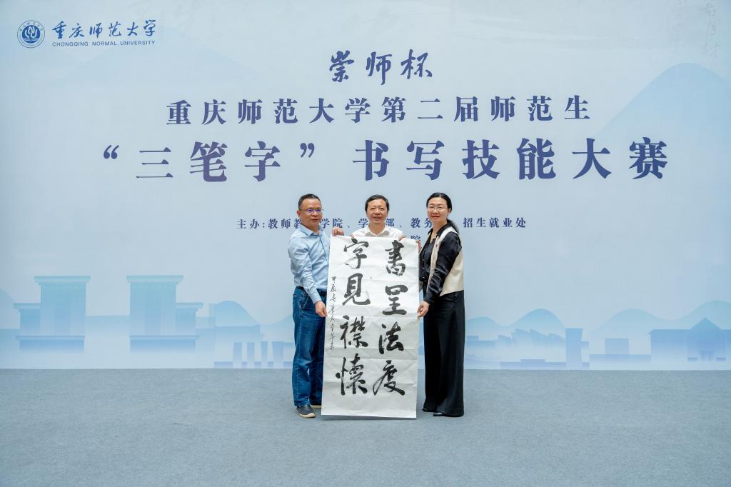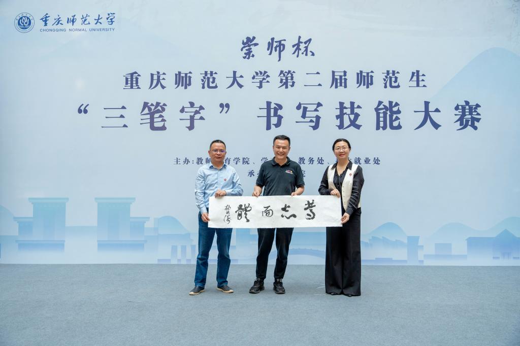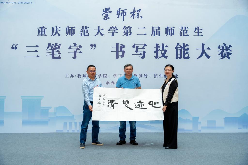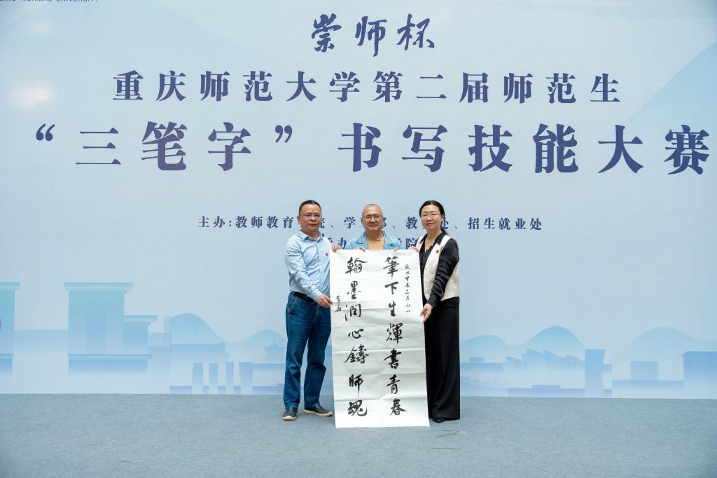 汉字之光,照亮中华文明;汉字书写,厚植育人初心。2024年4月18日,由mansion88明升、学工部、教务处、招生就业处主办,美术学院承办的重庆师范大学“ 崇师杯”第二届师范生“三笔字”书写技能大赛决赛在博雅楼圆满举行。校党委常委、副校长孟小军,mansion88明升、学工部、教务处、招生就业处、国内合作与联络中心主要负责人以及相关学院负责人出席并观摩大赛。大赛还特别邀请到重师附小、附二小、附中的学生代表同台竞技。
