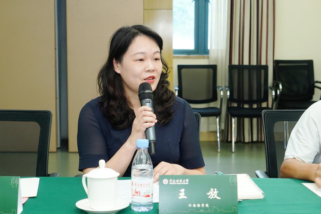 随后,外国语学院党委书记王放作为项目承担学院分管领导代表发言,她在发言中指出,教师培训工作不能只算经济账,更应关注平台与资源的整合。她分享了外国语学院利用培训资源在职前职后一体化、搭建交流平台、建设人才资源库及拓展实习就业基地等方面的具体做法,并强调这些举措对于促进教育资源共享的重要作用,还建议建立培训学员回访追踪机制,确保培训效果的长效性,并提议构建教师培训公共课程专家资源库,为全校乃至更广范围的教育发展提供智力支持。