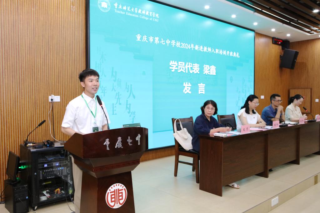 新进教师梁鑫代表学员发言,表达了潜心学习,勇于实践,实现岗位成长的信心和决心。