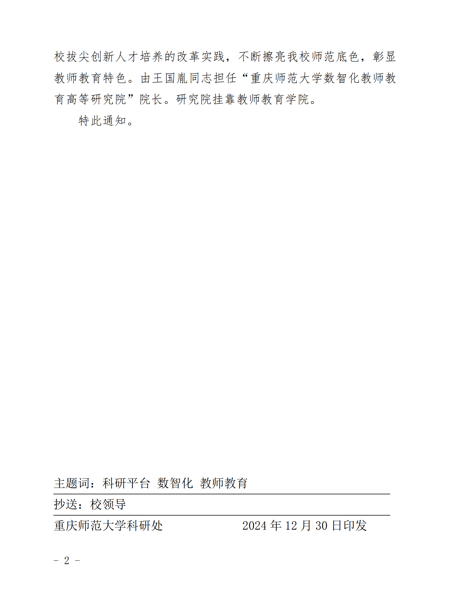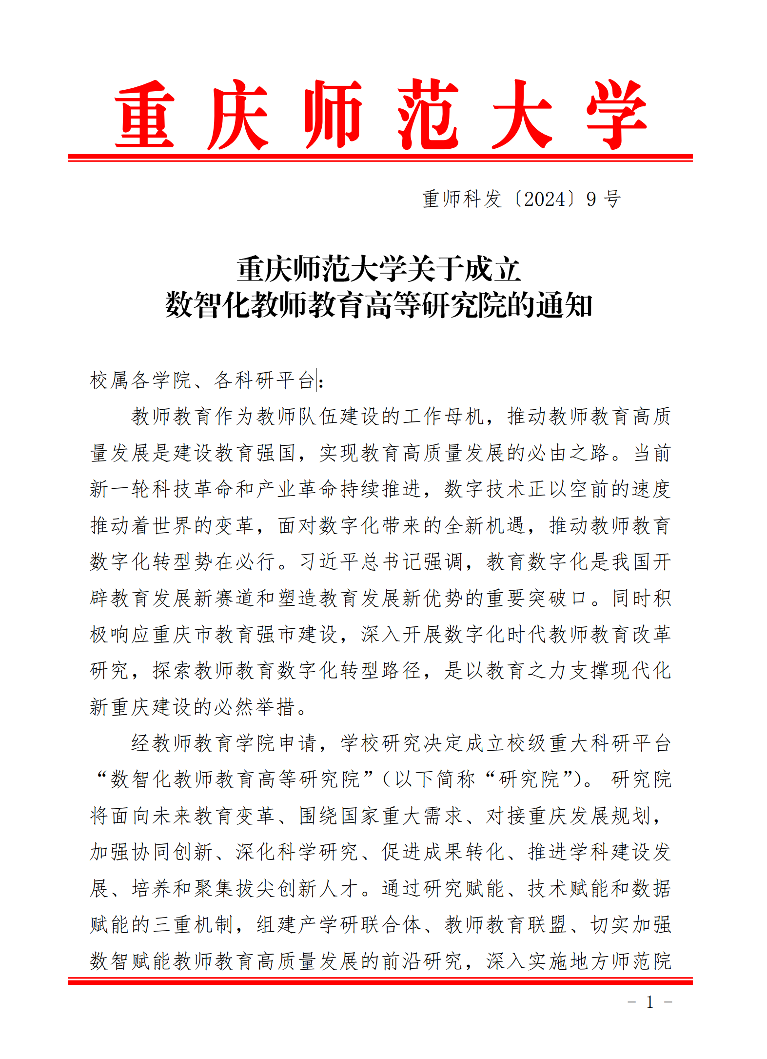 经mansion88明升申请,学校研究决定成立校级科研平台“数智化教师教育高等研究院”(以下简称“研究院”)。 研究院将面向未来教育变革、围绕国家重大需求、对接重庆发展规划,加强协同创新、深化科学研究、促进成果转化、推进学科建设发展、培养和聚集拔尖创新人才。通过研究赋能、技术赋能和数据赋能的三重机制,组建产学研联合体、教师教育联盟、切实加强数智赋能教师教育高质量发展的前沿研究,深入实施地方师范院校拔尖创新人才培养的改革实践,不断擦亮我校师范底色,彰显教师教育特色。由王国胤同志担任“重庆师范大学数智化教师教育高等研究院”院长。研究院挂靠mansion88明升。
