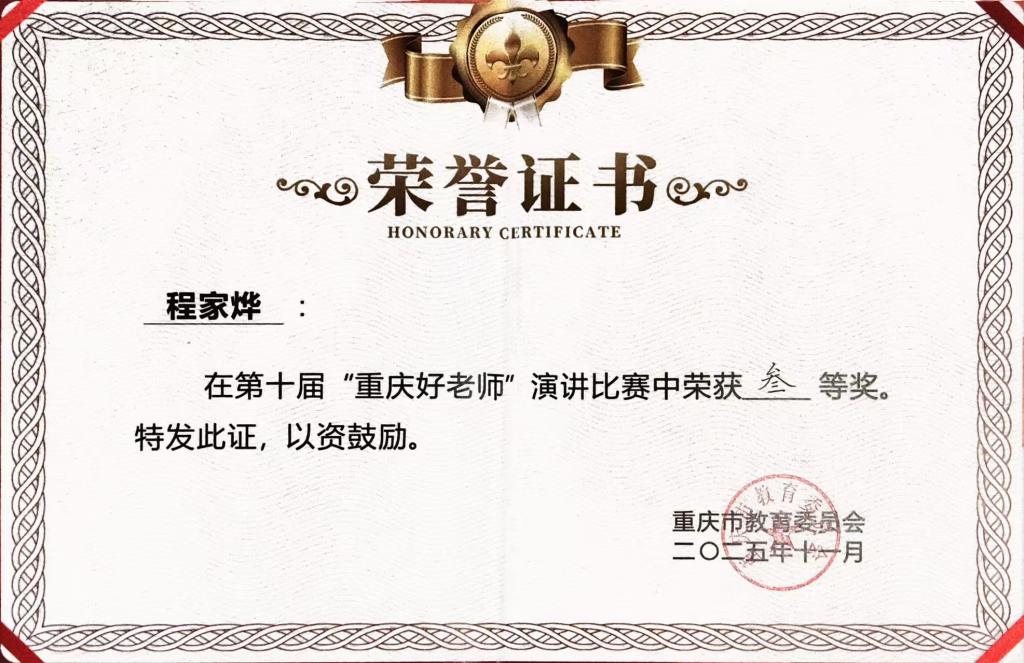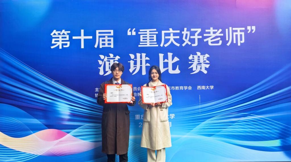 2025年11月23日,第十届“重庆好老师”演讲比赛决赛在西南大学圆满落幕。经过学院初赛、学校选拔赛及市级决赛的层层比拼,我校教育科学学院傅童佳、物理与电子工程学院程家烨分别荣获二等奖、三等奖。