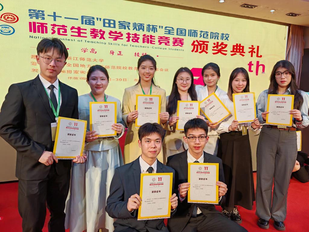 2025年11月28日至30日,第十一届“田家炳杯”全国师范院校师范生教学技能竞赛决赛在浙江师范大学举行。我校荣获一等奖4项,二等奖5项,三等奖3项,优胜奖1项,13名参赛选手全部获奖,总获奖率和获奖层次较去年显著提升。