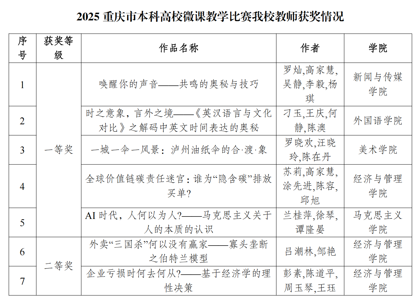 近日,2025年重庆市本科高校微课教学比赛结果正式揭晓,我校教师凭借扎实的教学功底、创新的教学设计与精湛的教学能力脱颖而出,再创佳绩,共斩获一等奖5项、二等奖2项,在全市高校中彰显了我校师资队伍建设的过硬实力与教学改革的丰硕成果。