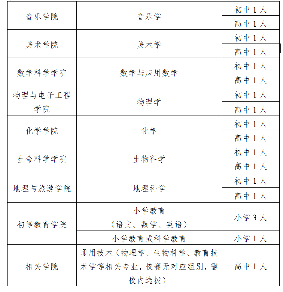 每个参赛院校按照每1个学段课程推荐1名参赛选手参加初赛,我校可报名师范专业与学段对应表如下:
