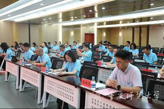 为贯彻“中新(重庆)战略性互联互通示范项目”有关精神,加强人才培养交流,培育一批卓越的中小学校长,提升基础教育办学水平,重庆市教委、财政局与新加坡南洋理工大学国立教育学院自2016年共同启动了卓越校长工程中新合作培养计划。重庆师范大学已经连续四年承担此项目的国内段培养工作。今年5月,在与新加坡南洋理工大学、重 庆市教委多次沟通协商后,重庆市卓越校长工程中新合作培 养计划第五期工作正式启动。6月30日上午,重庆市卓越校长工程中新合作培养计划第五期启动仪式在我校大学城校区博雅楼503会议室举行。重庆市教育委员会国际合作与交流处处长李斌、人事处副处长胡天勇,新加坡南洋理工大学国立教育学院中国项目部主任孔丽娟莅临了会议,来自重庆市24个区县的32名中小学书记、校长参加了此次启动仪式。仪式由我校副校长孟小军主持。