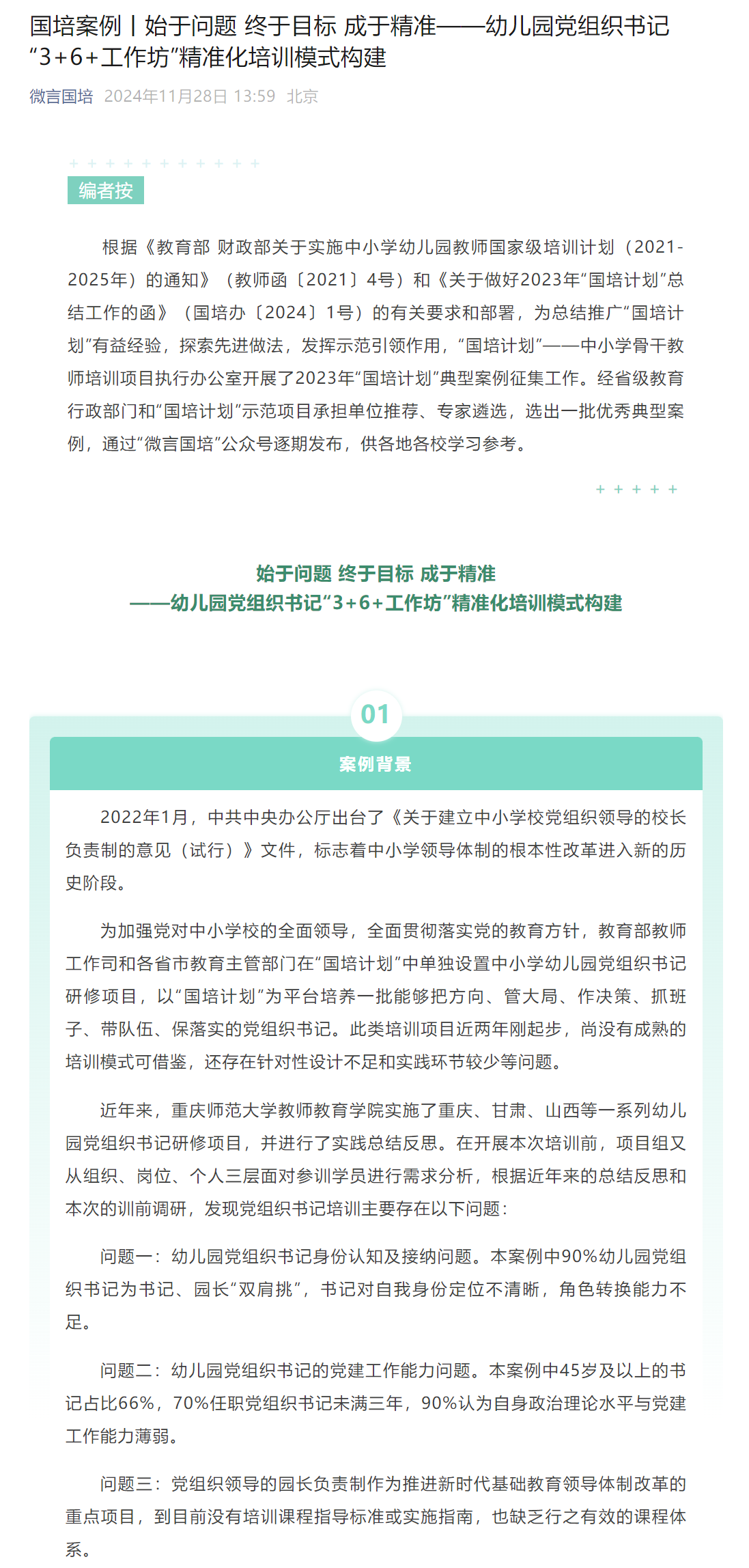 近日,学校mansion88明升提交的《始于问题 终于目标 成于精准——幼儿园党组织书记“3+6+工作坊”精准化培训模式构建》培训案例被教育部国培办推选为优秀典型案例,并通过“微言国培”公众号向全国推广。