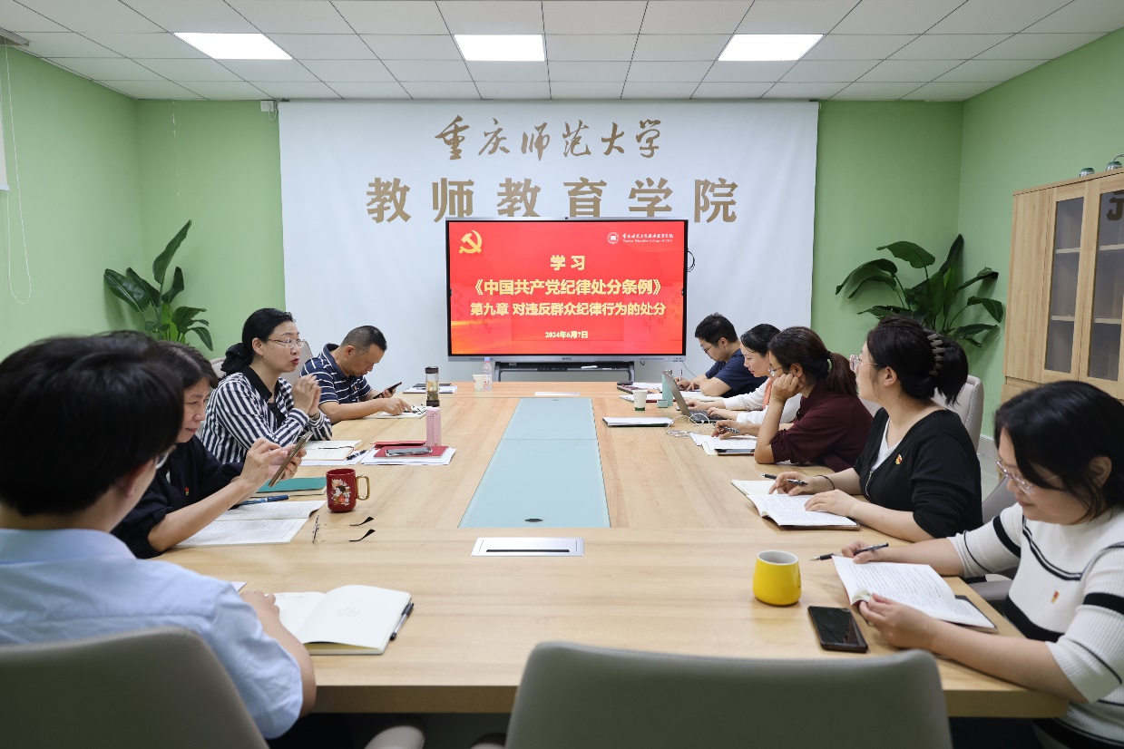 202467日下午,mansion88明升教工党支部开展“严守纪律底线 擦亮政治本色主题党日活动。党员同志们深入学习中国共产党重庆市第六届委员会第五次全体会议决议精神,并就《中国共产党纪律处分条例》进行了专题学习。