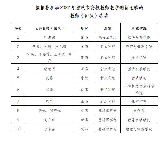 2.拟推荐参加2022年重庆市高校教师教学创新比赛的教师(团队)名单