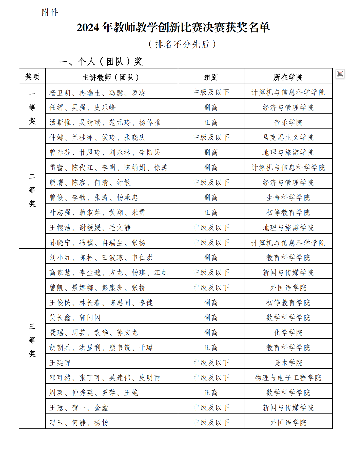 根据《关于举办重庆师范大学“师贤杯”2024年教师教学创新比赛的通知》(重师教师教育〔202427号)要求,经学院初赛选拔推荐、全校决赛比拼,评选出一等奖3名、二等奖8名、三等奖12名,优秀组织奖3个。现将结果予以公示(具体名单附后)。
